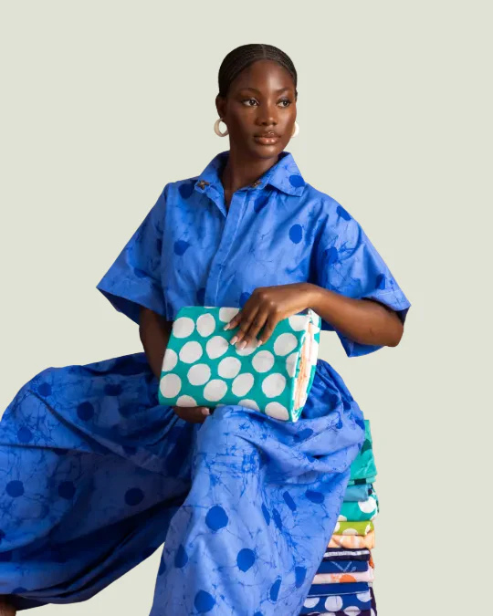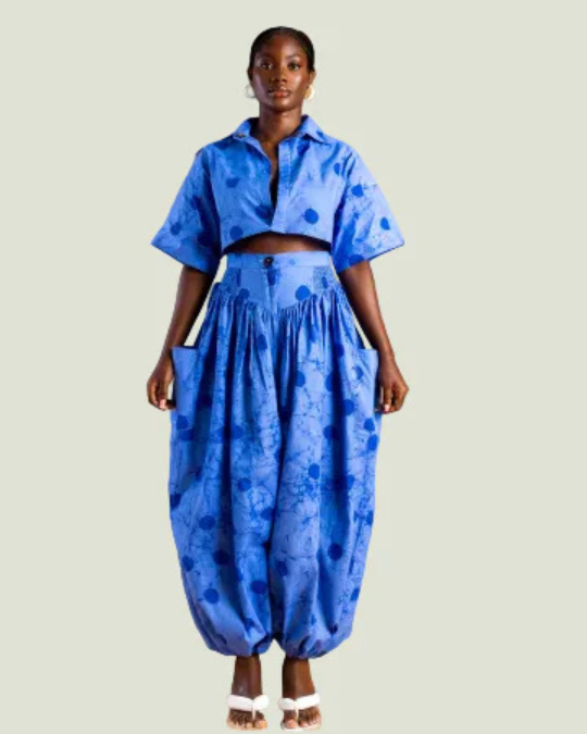 Eseose is an ankle length panelled baggy trouser featuring a horizontal smocked waistline detail and functional patch pockets on the sides.