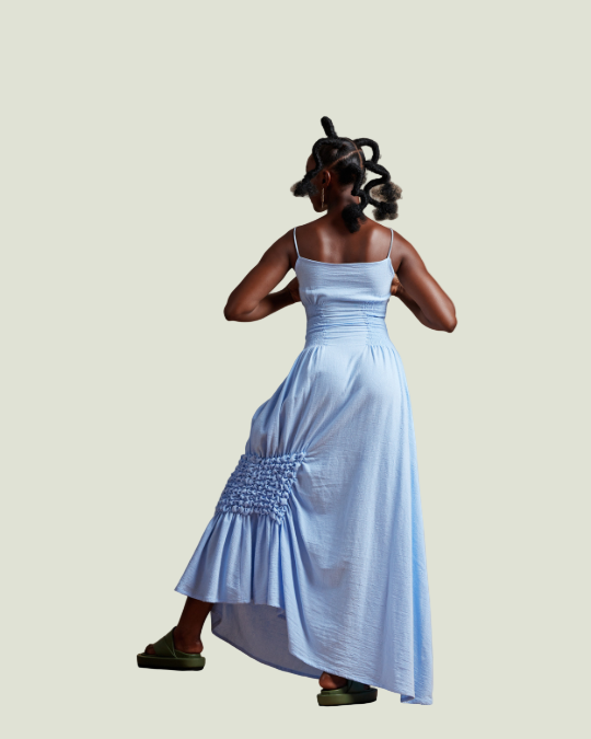 Fade is a midi smocked asymmetric hemline dress with adjustable spaghetti straps made from 100% cotton. This dress has a square horizontal lined smocked effect from the underbust to waistline and a square smocked design at the knee area on the left side of the dress, giving an elegant gathered asymmetrical fall.
